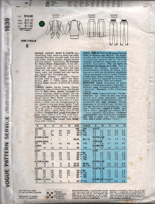 Patrón de costura vintage de los años 80 para chaqueta, pantalones y falda con cuello ancho drapeado para mujer de JENNY SHARP, Vogue Individualist 1639, talla 8 o 10
