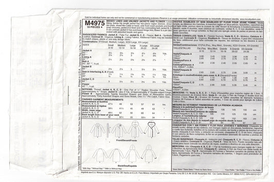 Patrón de costura agotado para chaquetas de piel y vellón de corte clásico para mujer PALMER/PLETSCH de McCall's 4975, talla S a L, sin cortar, doblado de fábrica