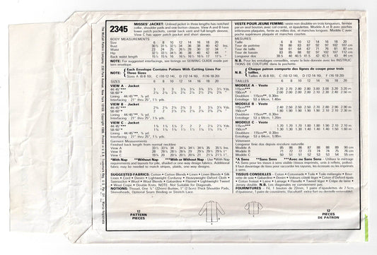 Patrón de costura vintage de los años 80 para chaqueta de manga corta o larga para mujer McCall's 2345, talla 6 a 10, sin cortar, doblada de fábrica