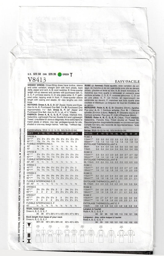 Patrón de costura para vestidos de mujer Vogue Easy Options 8413 con variaciones, agotado, talla 8-16, sin cortar, doblado de fábrica