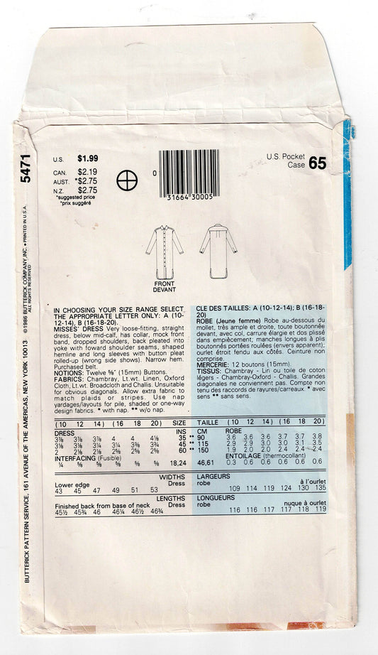 Patrón de costura de vestido camisero recto fácil para mujer Butterick See & Sew 5471, años 80, sin cortar, doblado de fábrica, talla 10 a 14