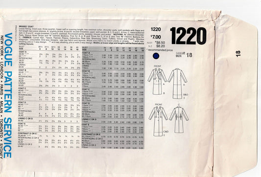 Patrón de costura Vogue Basic Design 1220 para abrigo clásico forrado para mujer, años 80, talla 18, busto de 40 pulgadas, sin cortar, doblado de fábrica