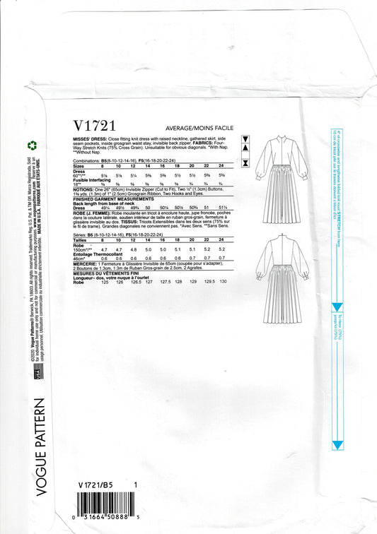 Patrón de costura original 1721 de Vogue Paris para vestido de invierno elástico de GUY LAROCHE con escote alto para mujer, talla 8-16, sin cortar, doblado de fábrica