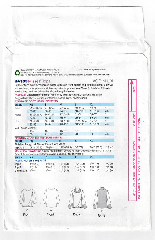 Patrón de costura agotado para suéter elástico con cuello alto y efecto cruzado Kwik Sew 4135 para mujer, talla XS a XL, sin cortar, doblado de fábrica