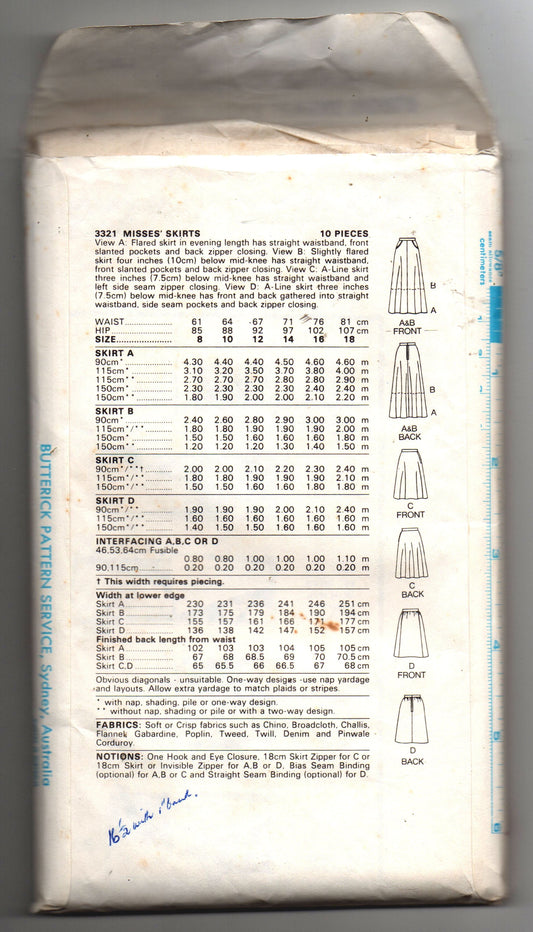 Patrón de costura vintage de los años 80 Butterick 3321 para faldas en forma de A con bolsillos para mujer, talla 16, sin cortar, doblado de fábrica