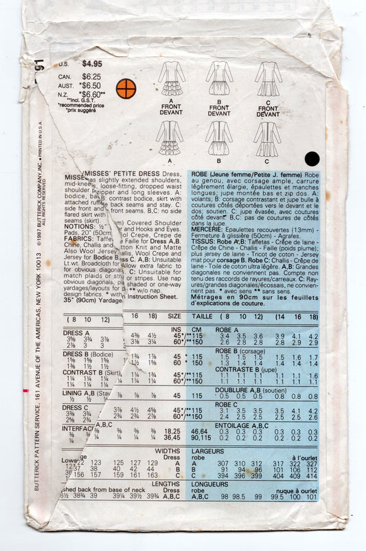 Patrón de costura vintage de los años 80 Butterick 5891 para vestido de talle bajo con volantes o pompones, talla 8-12, doblado de fábrica, sin cortar