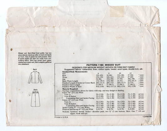 Patrón de costura vintage de los años 1980 para chaqueta y falda con forma de mujer Kwik Sew 1184, busto de 32 a 37 pulgadas, sin cortar, doblado de fábrica