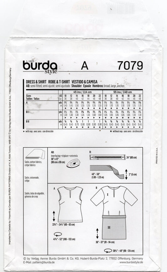 Patrón de costura Burda Style 7079 para vestido y camisa de verano para mujer, sin estampado, tallas 10 a 22, doblado de fábrica y sin cortar