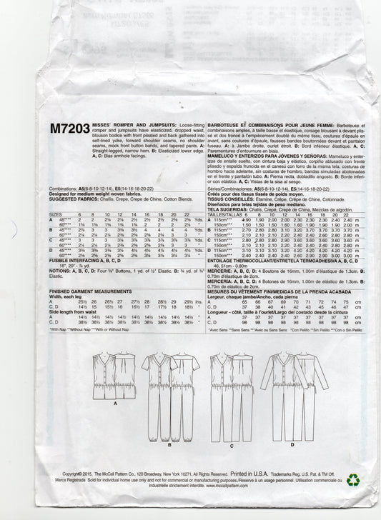 Patrón de costura agotado para monos y mamelucos de cintura baja para mujer McCall's M7203, talla 14-22, sin cortar, doblado de fábrica