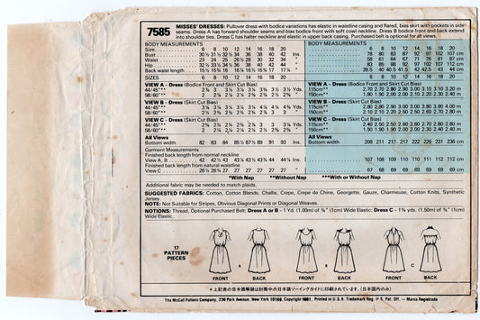 Patrón de costura vintage de los años 80 para vestido de verano de mujer McCall's 7585 en 3 estilos, talla 12, busto 34 pulgadas