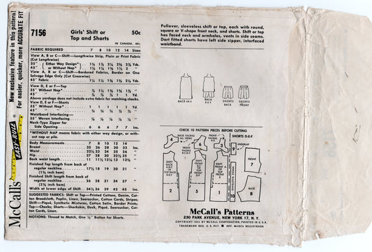 Patrón de costura vintage de los años 60 para vestido camisero de verano para adolescentes McCall's 7156, top y pantalones cortos, talla 12