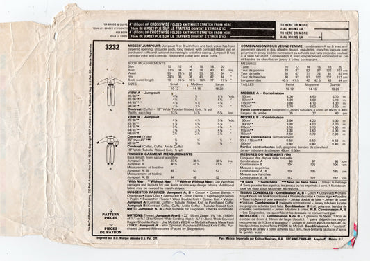 Mono informal con cremallera delantera y bolsillos para mujer de McCall's 3232 Patrón de costura vintage de los años 80 Talla MEDIANA 12-14 SIN CORTAR Doblado de fábrica
