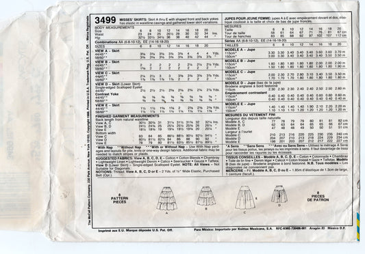 Patrón de costura vintage de los años 80 para faldas acampanadas con volantes en capas para mujer McCall's 3499, talla 6 a 12