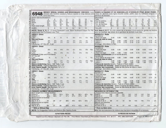 Patrón de costura para vestido de novia o de dama de honor con encaje romántico exclusivo de McCall ALICYN para mujer, años 90, talla 12, busto de 34 pulgadas, sin cortar, doblado de fábrica