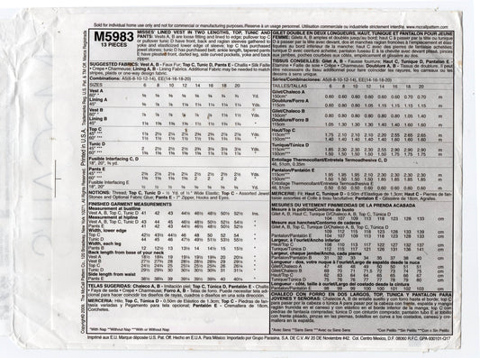 Patrón de costura sin cortar de McCall's M5983 para chaleco de piel para mujer, túnica y pantalones, fuera de impresión, tallas 6 a 14, doblado de fábrica