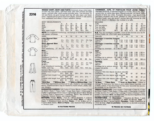 Patrón de costura vintage de los años 80 para camisa, falda y pantalones plisados informales para mujer McCall's 2316, talla 14, sin cortar, doblado de fábrica