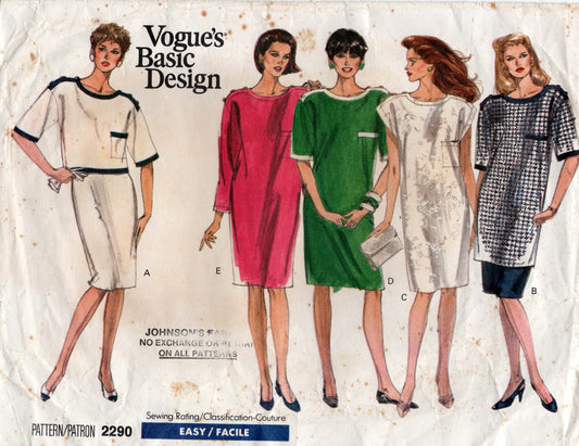Patrón de costura vintage de los años 80 para mujer Vogue Basic Design 2290, vestido, blusa y falda con bordes en contraste, talla 8 a 12