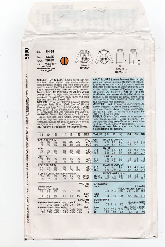 Patrón de costura vintage de los años 80 para blusa y falda de manga larga para mujer Butterick 5890, talla 8 a 12, sin cortar, doblado de fábrica