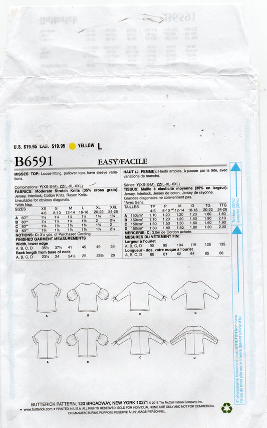 Patrón de costura agotado para blusas con volados y elásticos fáciles de usar para mujer Butterick B6591, talla XS a M, doblado de fábrica sin cortar