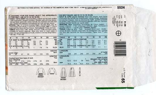 Patrón de costura vintage de los años 80 para blusa y falda con fajín y mangas dolman para mujer Butterick See & Sew 5524, talla 8-20, doblado de fábrica y sin cortar