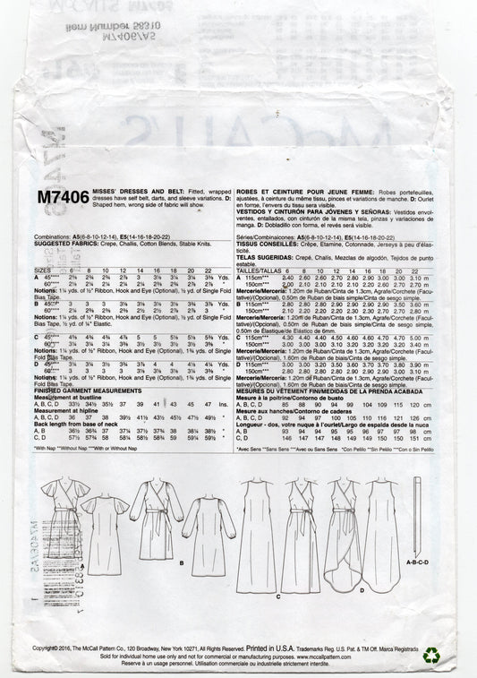 Patrón de costura de vestido cruzado McCall's 7406 para mujer, sin cortar, doblado de fábrica, tallas 6 a 14
