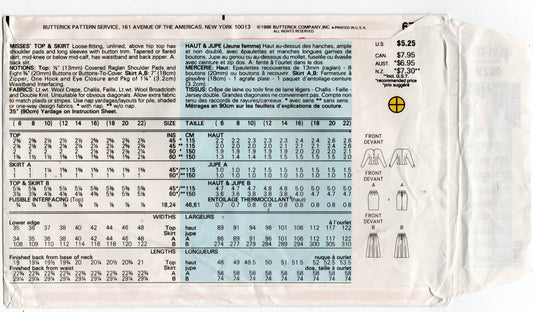 Patrón de costura vintage de los años 80 para blusa y falda con mangas dolman para mujer Butterick 6780, talla 12-16