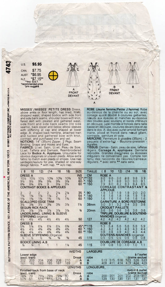 Butterick 4743 Vestido de novia o de dama de honor con corte princesa, cintura baja y costuras, para mujer, con cola opcional, patrón de costura vintage de los años 80, tallas 8 a 12 o 14 a 18
