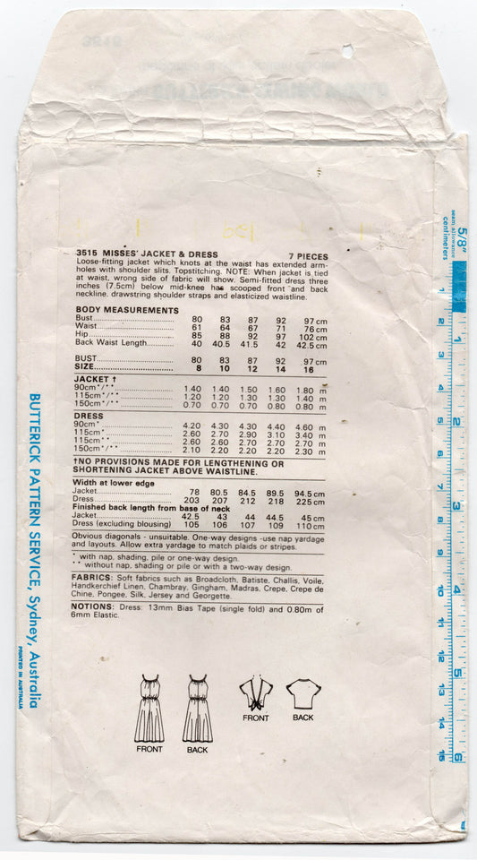 Patrón de costura Butterick 3515 para chaqueta y vestido con lazo delantero para mujer, estilo vintage de los años 80, talla 8 a 12