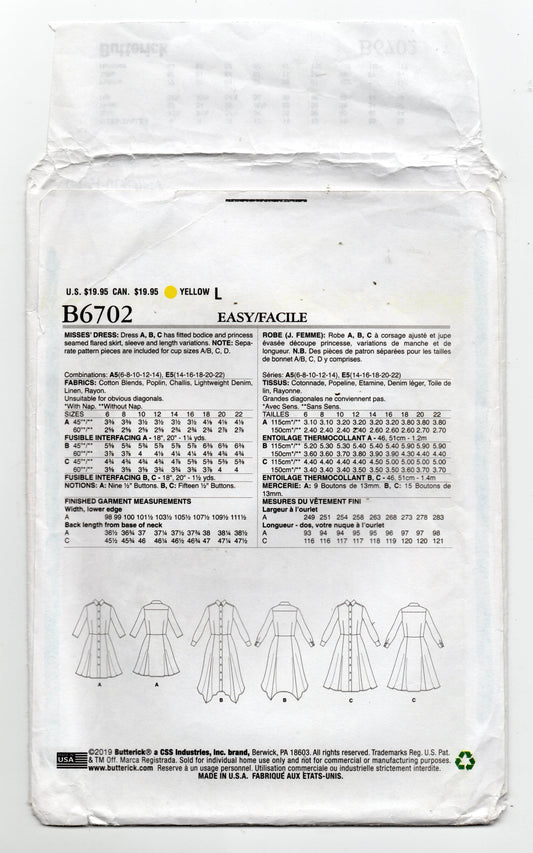Patrón de costura de vestidos camiseros ajustados y acampanados para mujer Butterick B6702, agotados, talla 6-14, sin cortar, doblado de fábrica
