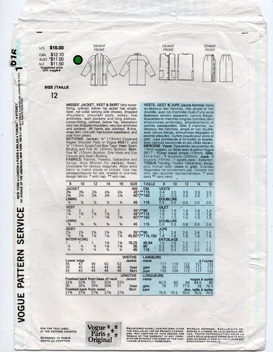 Patrón de costura original de Vogue Paris 1616 para chaqueta, chaleco y falda de GUY LAROCHE para mujer, años 80, talla 12, busto 34 pulgadas