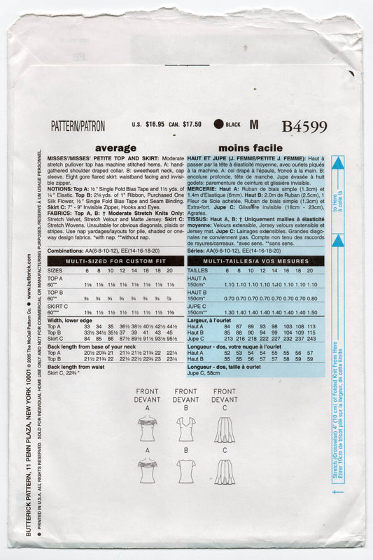 Patrón de costura de blusa fruncida y falda acampanada para mujer Butterick B4599 CHETTA B, agotado, tallas 14 a 20, sin cortar, doblado de fábrica