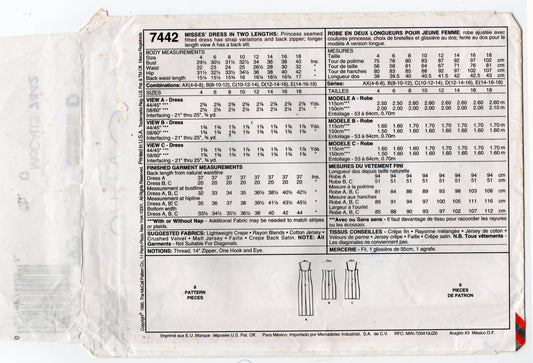Patrón de costura vintage de los años 90 para vestido de noche de mujer con tirantes cruzados 7442 de McCall, talla 10-14, sin cortar, doblado de fábrica