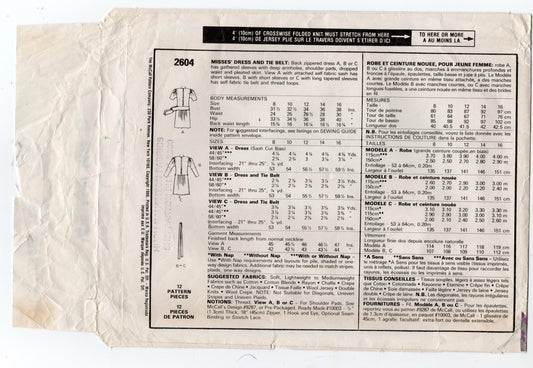 Patrón de costura vintage de los años 80 para vestido de mujer con cintura caída y faja 2604 de McCall, talla 12 o 16