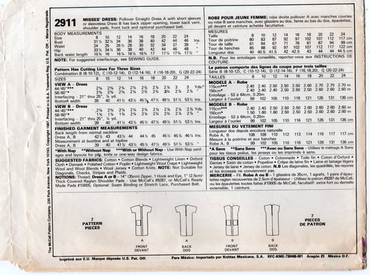 Patrón de costura sencillo para vestido recto McCall's 2911 para mujer, estilo vintage de los años 80, talla 12-16