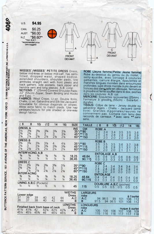 Butterick 4069 KATHRYN CONOVER Vestido de talle bajo con pliegues para mujer Patrón de costura vintage de los años 80 Talla 12-16