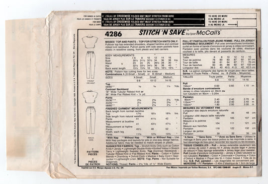 Patrón de costura vintage de los años 80 para jersey y pantalones elásticos fáciles de estirar McCall's 4286 con bolsillos, talla 6-12, sin cortar, doblado de fábrica