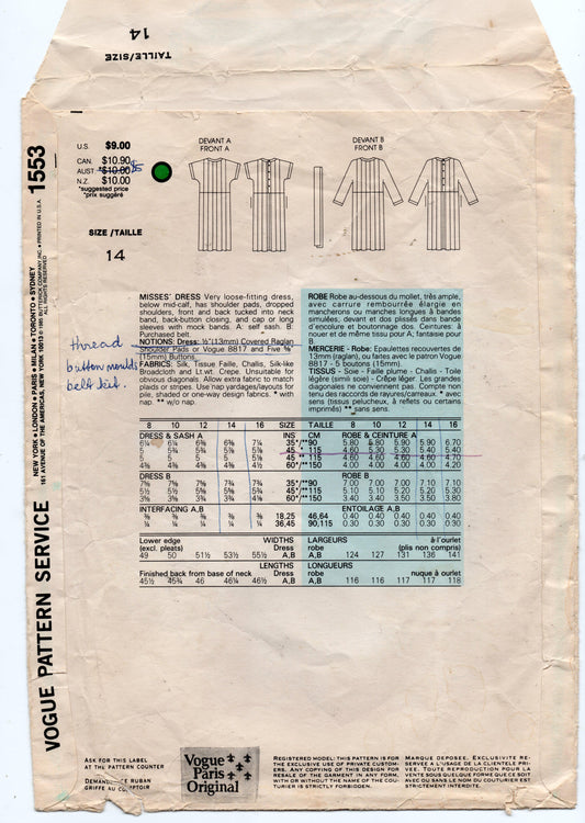 Patrón de costura original de Vogue Paris 1553 GUY LAROCHE para vestido plisado con cintura baja para mujer, años 80, talla 14, busto 36 pulgadas