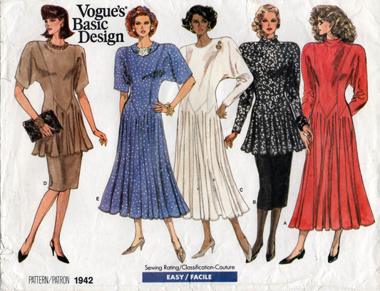 Patrón de costura vintage de los años 80 para vestido túnica y falda con mangas dolman para mujer, diseño básico de Vogue 1942, tallas 8 a 12 o 14 a 18, sin cortar, doblado de fábrica