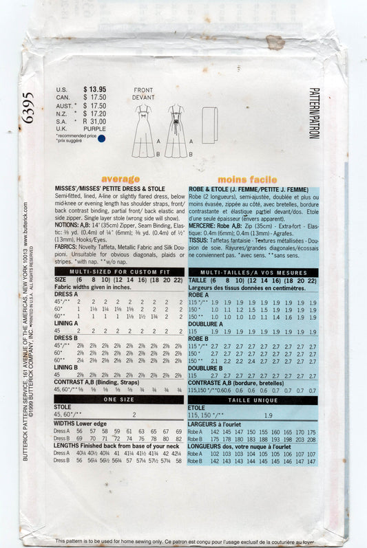 Patrón de costura vintage de los años 90 Butterick 6395 NICOLE MILLER para vestido de fiesta formal con escote en la espalda y estola para mujer, talla 18-22, sin cortar, doblado de fábrica