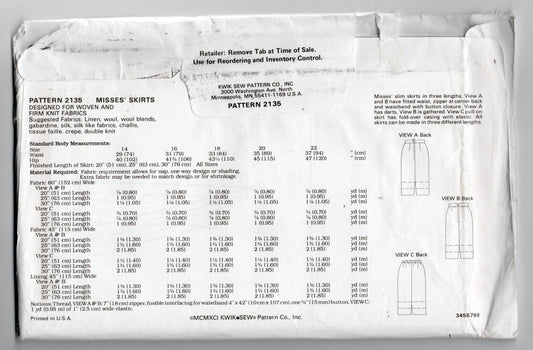 Patrón de costura Kwik Sew 2135 para faldas ajustadas de talla grande para mujer, estilo vintage de los años 90, talla 14 a 22, sin cortar, doblado de fábrica