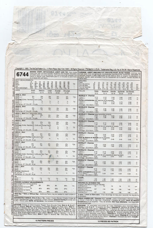 Patrón de costura vintage de los años 90 para camisas clásicas con jabot y corbata para mujer de talla grande McCall's 6744, tallas 20 y 22, sin cortar, doblado de fábrica