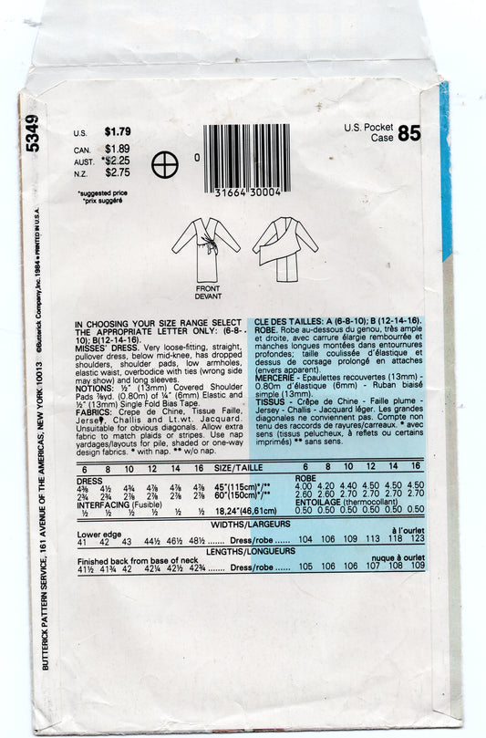 Patrón de costura vintage de los años 80 para vestido tipo jersey con cuello alto y efecto cruzado para mujer Butterick See & Sew 5349, talla 6 a 10, pliegues de fábrica sin cortar