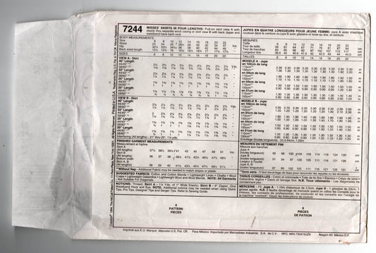 Patrón de costura McCall's 7244 para faldas rectas clásicas Palmer Pletsch de 1 hora para mujer, década de 1990, talla 12, sin cortar, dobladas de fábrica