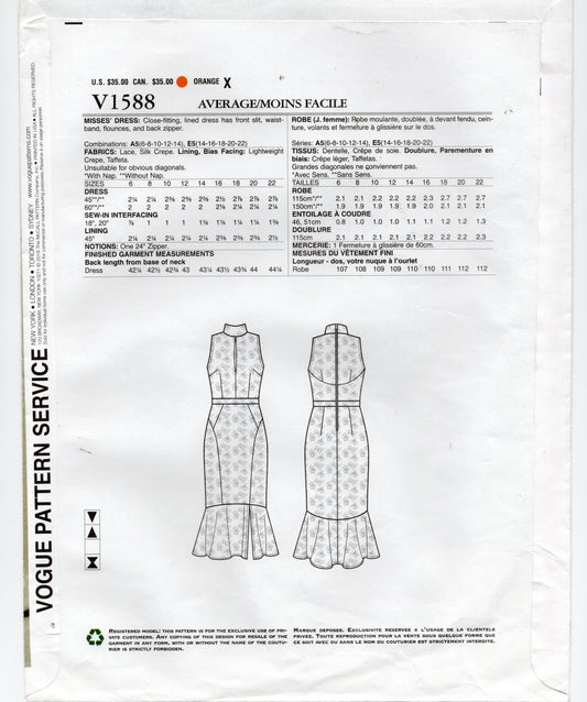 Patrón de costura agotado para vestido de noche con volantes y forro de REBECCA VALLANCE, original de la diseñadora Vogue V1588, talla 6-14, sin cortar, doblado de fábrica