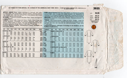 Patrón de costura de vestido estilo blusón para mujer Butterick 3655 Claudia Cooper, años 80, talla 14-18, sin cortar, doblado de fábrica