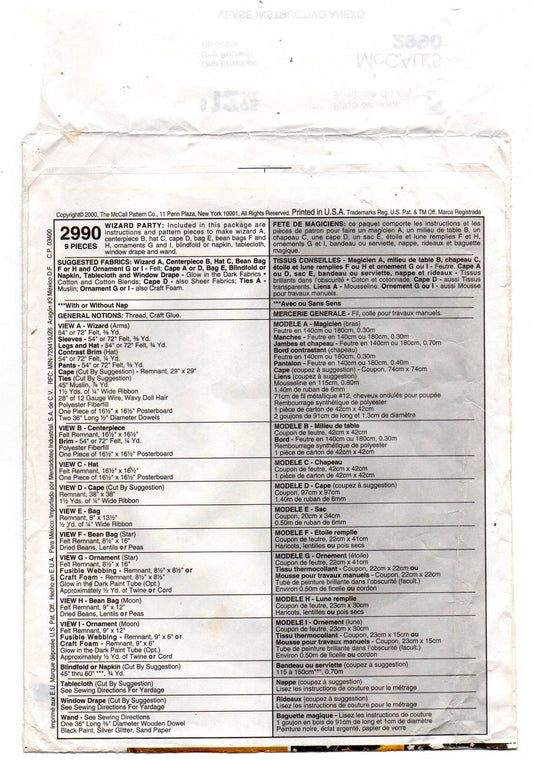 Patrón de costura agotado para decoraciones de fiesta de magos McCall's 2990, sombreros y capas, doblado de fábrica y sin cortar