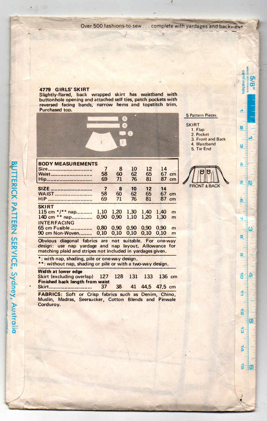 Patrón de costura vintage de los años 70 para falda cruzada para niñas Butterick 4779, talla 8