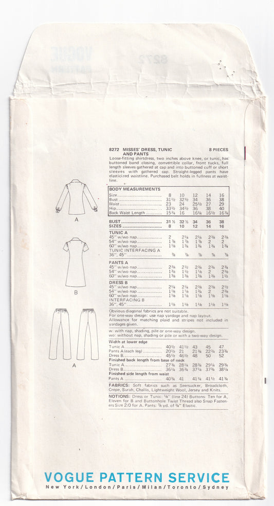 Vogue 8272 Womens Wide Collar Tucked Bodice Dress Blouse & Pants 1970s Vintage Paper Sewing Pattern Size 12 Bust 34 Inches UNCUT Factory Folded