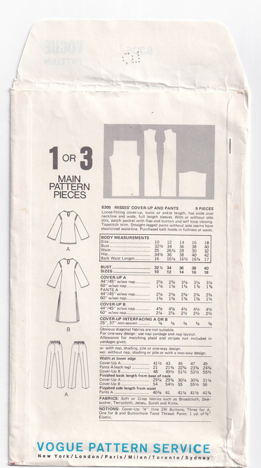 Vogue 8305 Womens EASY Maxi Length Caftan Tunic & Pants 1970s Vintage Paper Sewing Pattern Size 12 Bust 34 Inches UNCUT Factory Folded