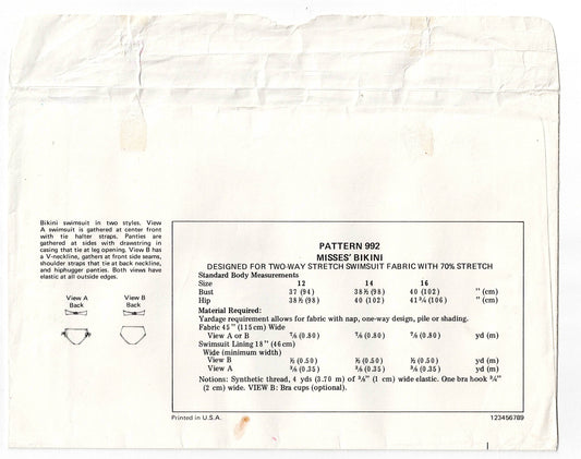 Patrón de costura vintage de los años 70 para traje de baño de bikini hipster elástico Kwik Sew 992 para mujer, busto de 37 a 40 pulgadas, sin cortar, doblado de fábrica